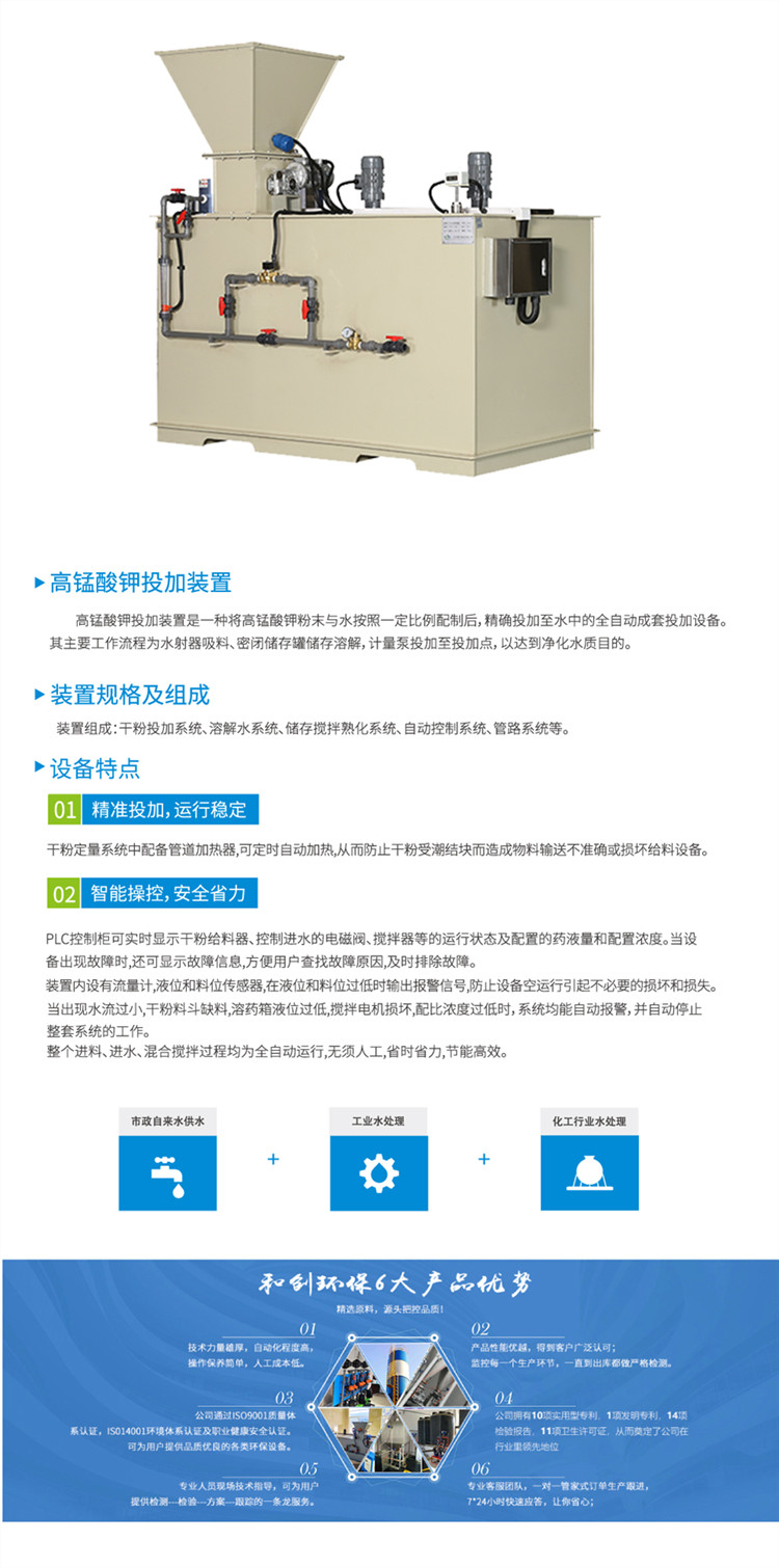 高锰酸钾投加工艺是治理“黄水”的有效途径,几年来的“黄水防治”成果证明,高锰酸钾有良好的氧化和助凝作用,原水经过高锰酸钾和氯组合工艺的预氧化之后,铁锰几乎都在水厂被去除,有效抑制了管道“黄水”产生的源头。 高锰酸钾具有腐蚀性强、易板结、易溶于水、易受潮的特性。 根据高锰酸钾的这些特性设计,高锰酸钾加药设备采用真空吸料进料、全密闭防止吸潮;采用耐腐蚀材料,罐体采用不锈钢AISI316L,各类密封采用氟胶材质,全面解决,一劳永逸。污水氧化助凝处理-高锰酸钾加药装置
